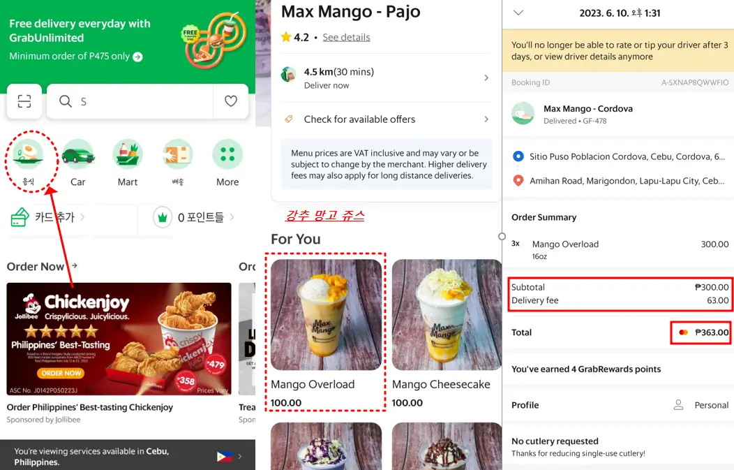 ▶제가 주문했던 곳은 max mango였고, 가장 기본으로 보이는 망고주스 3개를 각 100페소씩 300페소와 배달비 63페소 합쳐 결제했습니다.